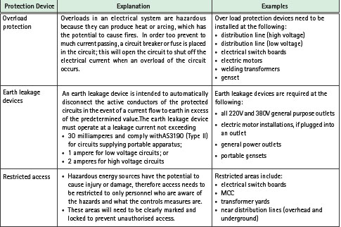 When performing working that directly interacts or is in the vicinity of electricity, the work must be completed in accordance with the relevant safe work procedure. If a safe work procedure does not exist then a job safety analysis will need to be completed. Examples of electrical hazards as outlined in table three must be systematically identified, evaluated and controlled to prevent personnel being electrocuted or exposed to electrical fires.