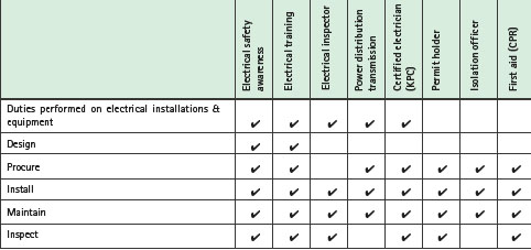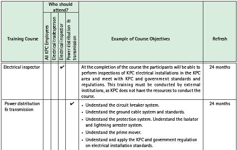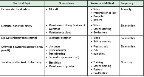 The general site induction shall include the electrical safety awareness training. The specific inductions for divisions or departments must discuss specific electrical hazards for that work area that employees maybe exposed to. Table 6 provides a summary of training courses provided for personnel who are exposed to electrical hazards within the work place and are required to install, maintain or inspect electrical installations and equipment
