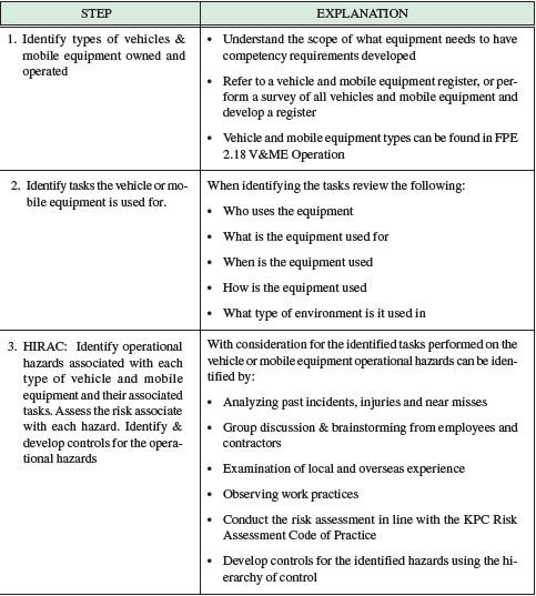 The operator competencies shall provide a list of the required qualifications and experience for operating specific vehicles or mobile equipment. The risk assessment will have identified controls for managing hazardous tasks and should list what amount of experience is necessary to operate the vehicles or mobile equipment.
