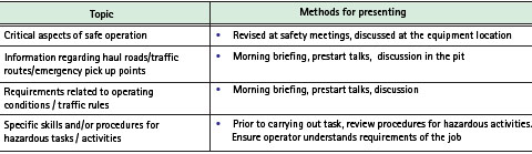 The operator competencies shall provide a list of the required qualifications and experience for operating specific vehicles or mobile equipment. The risk assessment will have identified controls for managing hazardous tasks and should list what amount of experience is necessary to operate the vehicles or mobile equipment.